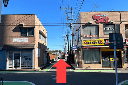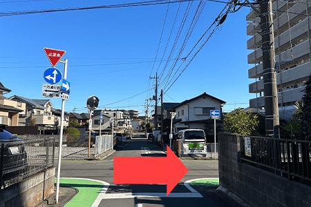 6こちらの十字路を右に曲がり、すぐ左手のマンションに当院があります。